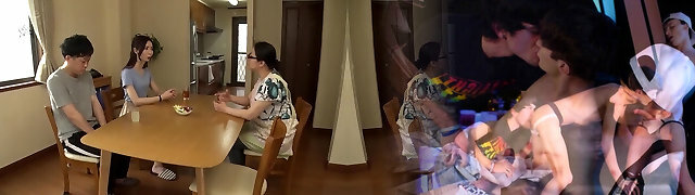 Japanese milf has hook-up with her stepdaughter's boyfriend and comes in his mouth fucking a dildo